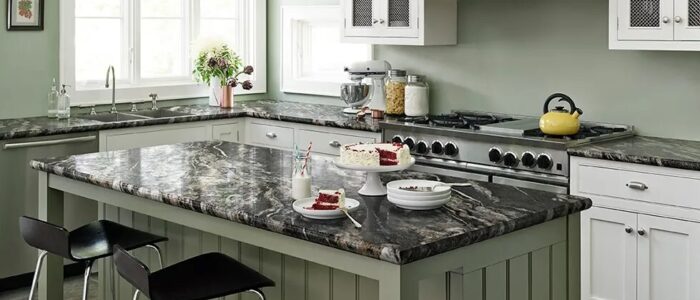 Laminate is a paper and resin blended material with a particle board or plywood base, offering endless colors and patterns. This material has been used in kitchens for decades because it's cost-effective, lightweight and easy to install and clean.