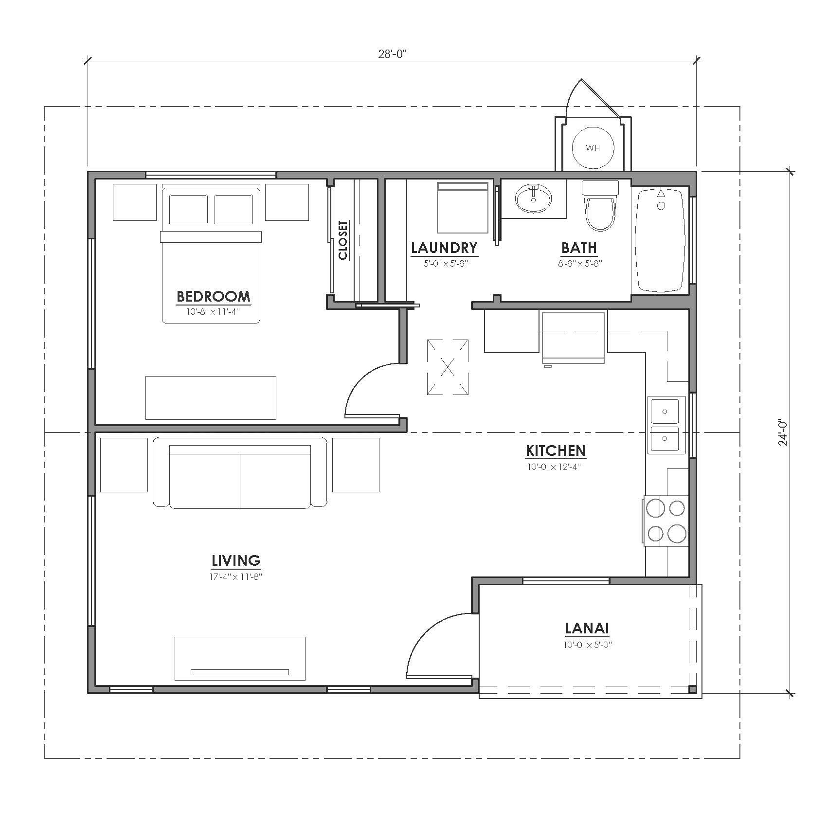 Discover our Kainani model. A thoughtfully designed 722 square foot home that makes the most of every inch. This efficient layout features a welcoming covered front lānai, an open-concept kitchen and living area, a full bedroom and bathroom and a dedicated laundry space.
