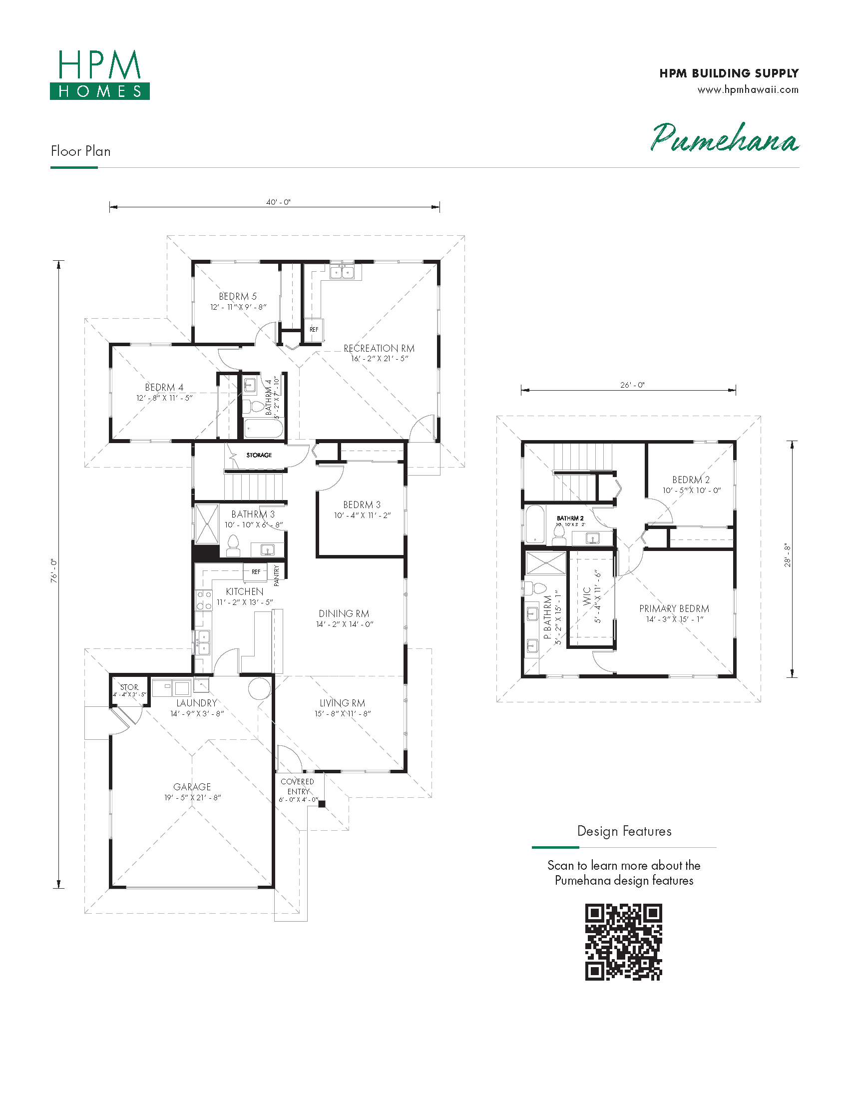 At nearly 3,000 square feet, the Pumehana is one of our roomiest homes with five bedrooms to accommodate a large, extended family. There's a separate entrance for the back of the home, and two bedrooms, a bath, and a large recreation room can be sealed off from the rest of the house for privacy. The upstairs primary suite includes a second bedroom that would make a great home office or baby’s room.